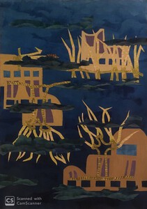 2020De mens wist de barrière van het water te slechten met bruggen, rekening houdend met wisselende waterstanden. Mixed media. 70 x 100,2 cm